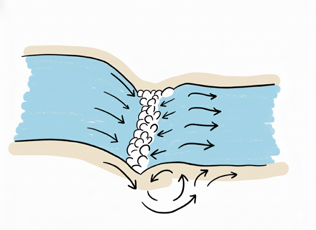 ホールとは小さな滝のようなものだ。下のイラストのように、上流から流れてきた水が地形や岩によってできた落差を勢いよく落ちると、その落ち口が小さな滝壺になり白波が立つ。落ちてきた水はそのまま深く潜りながら下流に流れ、やがて水面に向かって浮き上がる。浮き上がった水は湯が沸く時のように水面にボコボコと丸い盛り上がり(ボイル)を形成する。このボイルラインから下流では、水は通常通り下流に向かって流れている(アウトウォッシュ)が、ボイルラインから上流側では、水が滝壺に向かって上流向きに流れている(バックウォッシュ)。