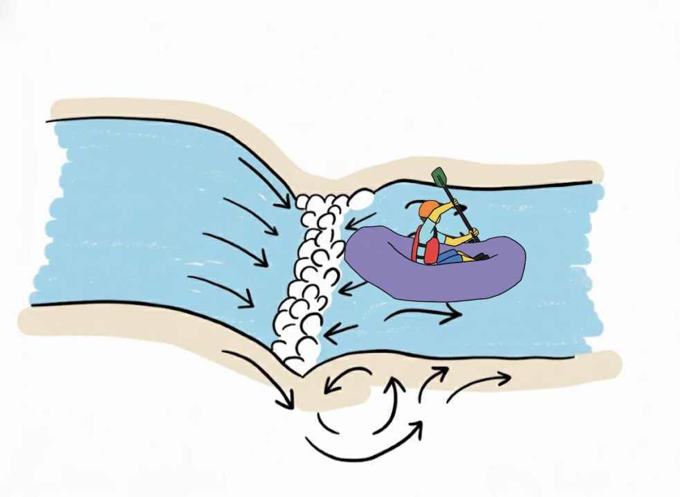 イラストでは、水の流れをわかりやすく表現するため川幅いっぱいの滝のような図になっているが、ダウンリバー中に出会うのは主に岩が隠れて形成されたホールだ。もしも実際にイラストのような滝に遭遇した場合はポーテージしたほうが良いだろう。また、このイラストに似たものとしてローヘッドダムがある。それこそ川幅いっぱいの人口の滝のようなものだ。落差がそれほど大きくないので行ける気がするかもしれないが、よく見てみると驚くほど下流にボイルラインがあり、絶対にチャレンジしては行けないことを悟るだろう。事実、ローヘッドダムで多くのパドラーが命を落としている。